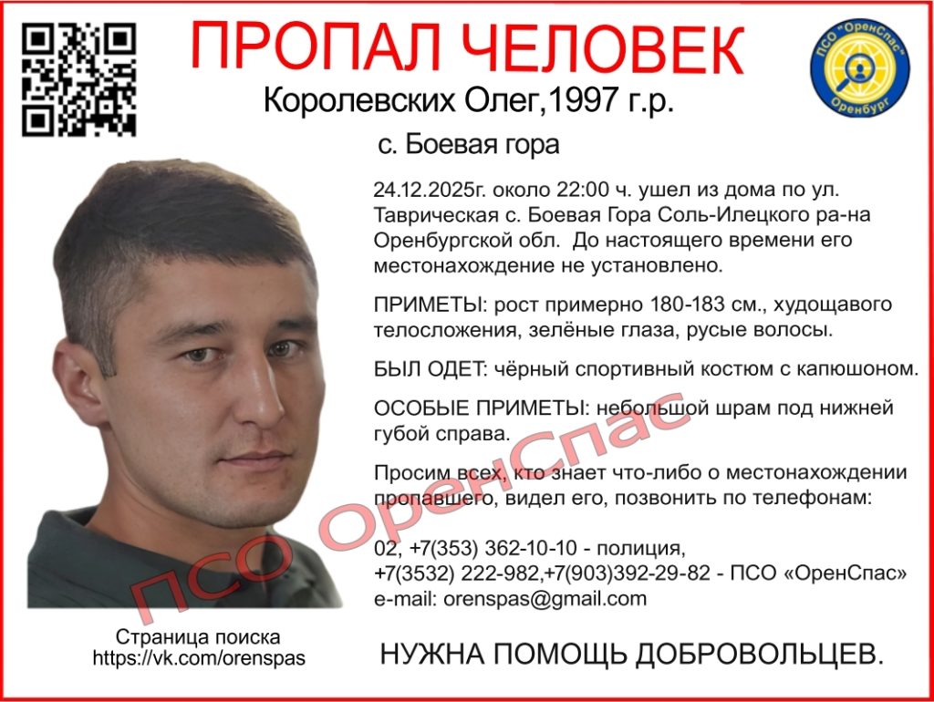 9 января 2026 года сотрудники аварийно-спасательной службы Оренбургской области провели очередные поисковые работы в Соль-Илецком муниципальном округе. Спасатели обследовали территорию в районе села Боевая Гора, где 24 декабря 2025 года пропал 28-летний местный житель Олег Королевских.