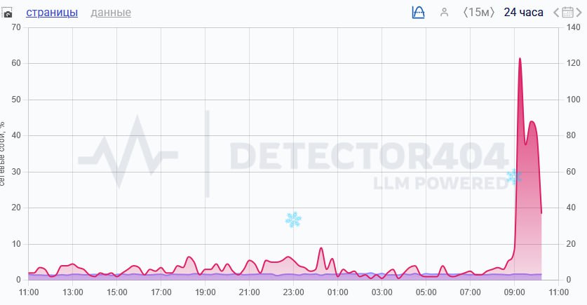 На момент публикации материала число сообщений о сбое растет. Оно выше обычного в 10-12 раз, следует из данных аналитических сервисов.
