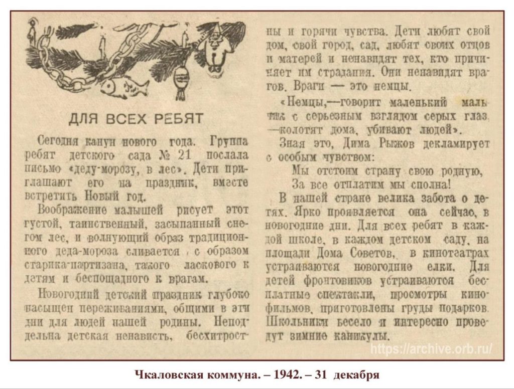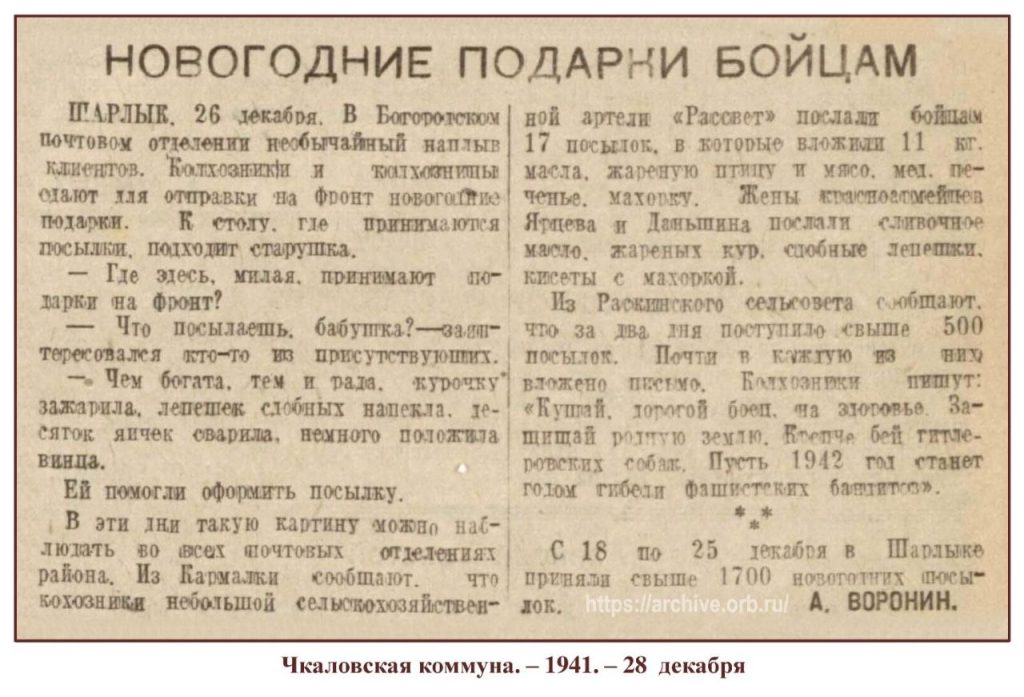 В новогодних выпусках областной газеты «Чкаловская коммуна» того времени публиковались заметки о том, как в тыловом Оренбуржье (тогда – Чкаловской области) готовились к его празднованию, а также собирали подарки на фронт, отмечали детские новогодние утренники и активно проводили зимние каникулы.