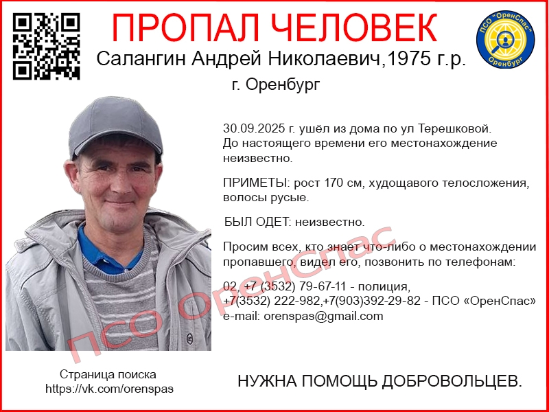 В Оренбургской области сотрудники полиции и волонтёры ПСО «ОренСпас» устанавливают местонахождение Андрея Салангина.