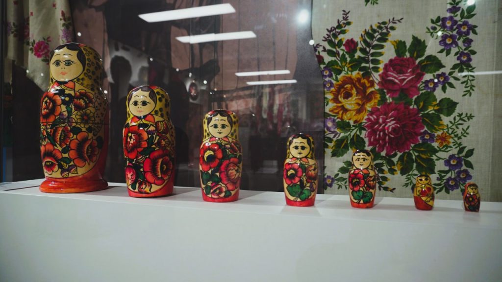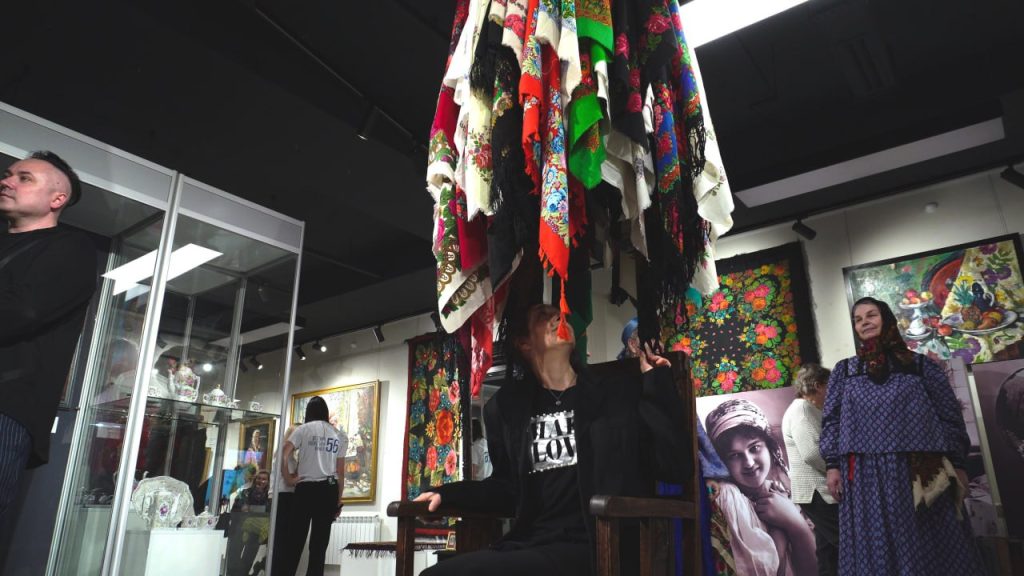 Центральная часть экспозиции — инсталляция из платков. Здесь представлены набивные павлопосадские платки второй половины XX века, редкий пуховый платок, созданный к Олимпиаде‑80, и уникальная паутинка с вязаными цветами. По задумке кураторов, зал превращается в настоящий «сад воспоминаний», где традиционные орнаменты разных эпох сливаются в единый образ весеннего пробуждения.