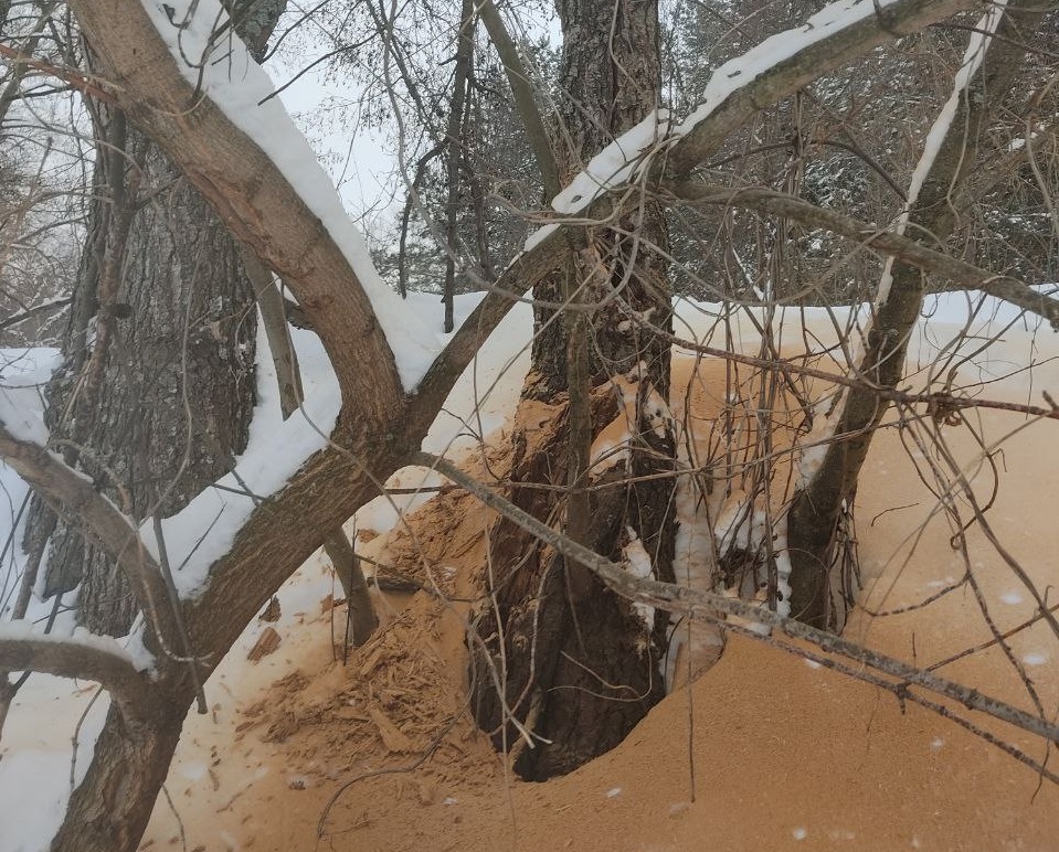 Гнилая древесина — это рассадник насекомых-ксилофагов и их личинок. Зимой, когда кора промерзает и добраться до спрятавшихся насекомых сложнее, дятлы проявляют чудеса изобретательности. Они буквально «сканируют» стволы на предмет пустот, — поясняют специалисты парка.