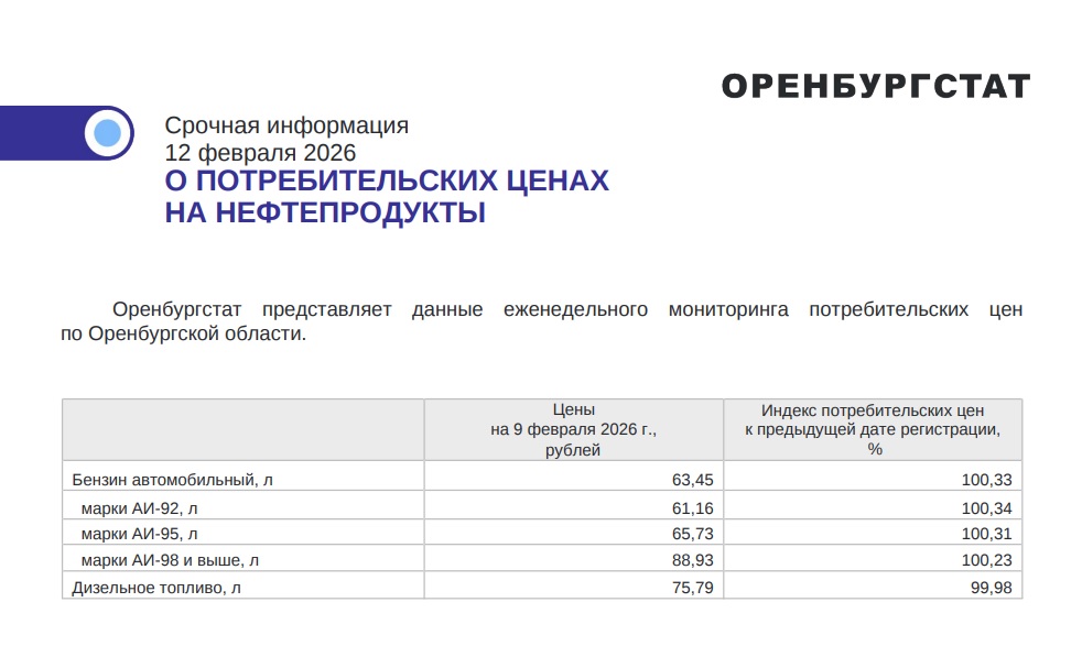 Оренбургстат представляет данные еженедельного мониторинга средних потребительских цен по Оренбургской области. Стоимость топлива может разниться в зависимости от сети АЗС.