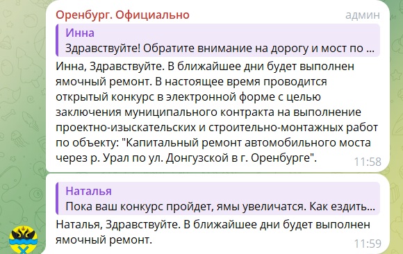 В ближайшие дни будет выполнен ямочный ремонт. В настоящее время проводится открытый конкурс в электронной форме с целью заключения муниципального контракта на выполнение проектно-изыскательских и строительно-монтажных работ по объекту: «Капитальный ремонт автомобильного моста через реку Урал по улице Донгузской в городе Оренбурге», — говорится в ответе.