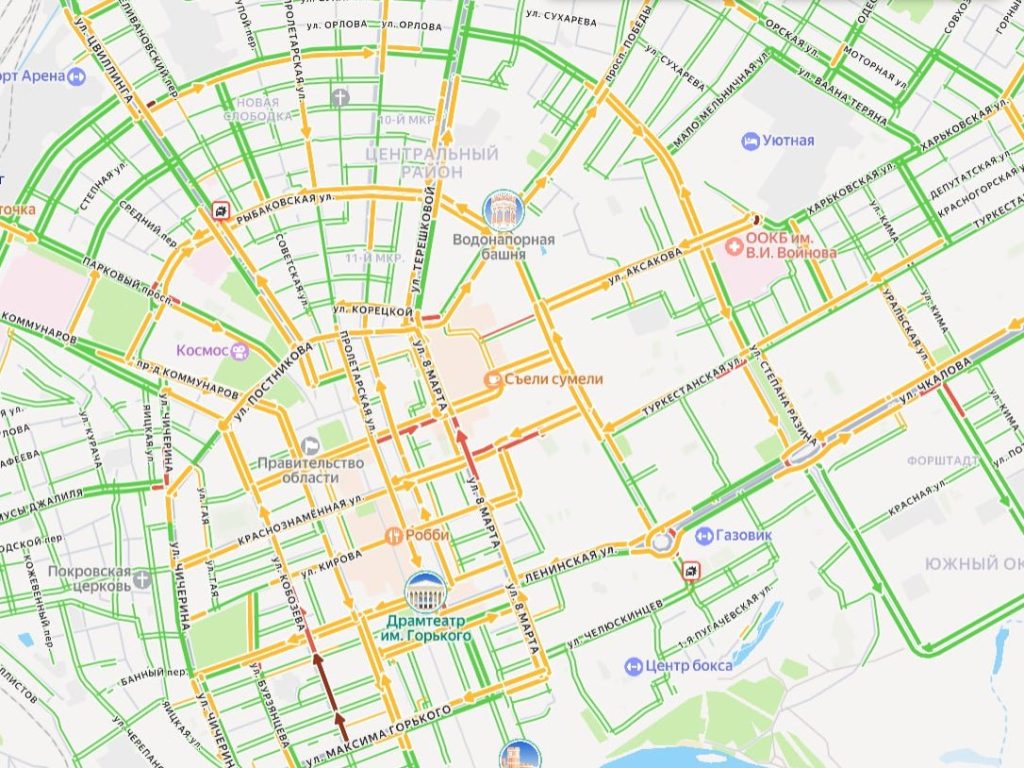 Утром 20 февраля дороги областного центра увязли в снегу. Непогода стала причиной массы ДТП. На онлайн-картах дороги Оренбурга дружно «пожелтели».