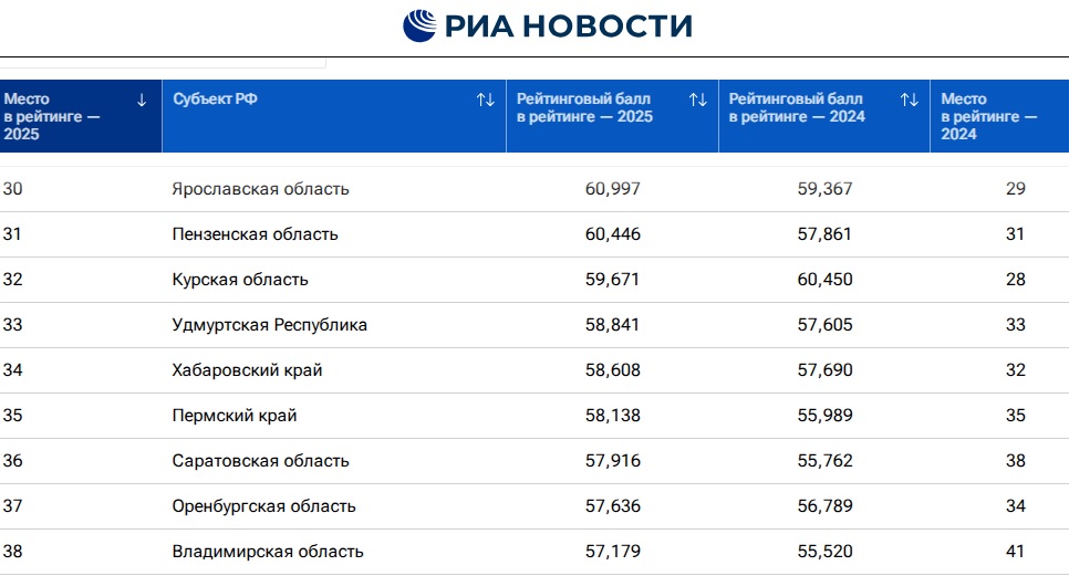 По итогам 2025 года область опустилась на три пункта – до 37 места. Правда, количество баллов увеличилось до 57,2.