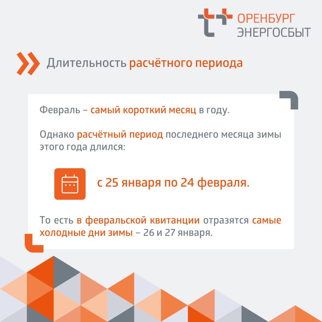 Несмотря на то, что февраль — самый короткий месяц в году, начисления производятся не за календарный месяц, а за период между снятиями показаний общедомовых приборов учёта: с 25 число предыдущего месяца по 24 число месяца, указанного в квитанции. Так что самые холодные дни зимы – 26 и 27 января – отразились в начислениях за февраль.