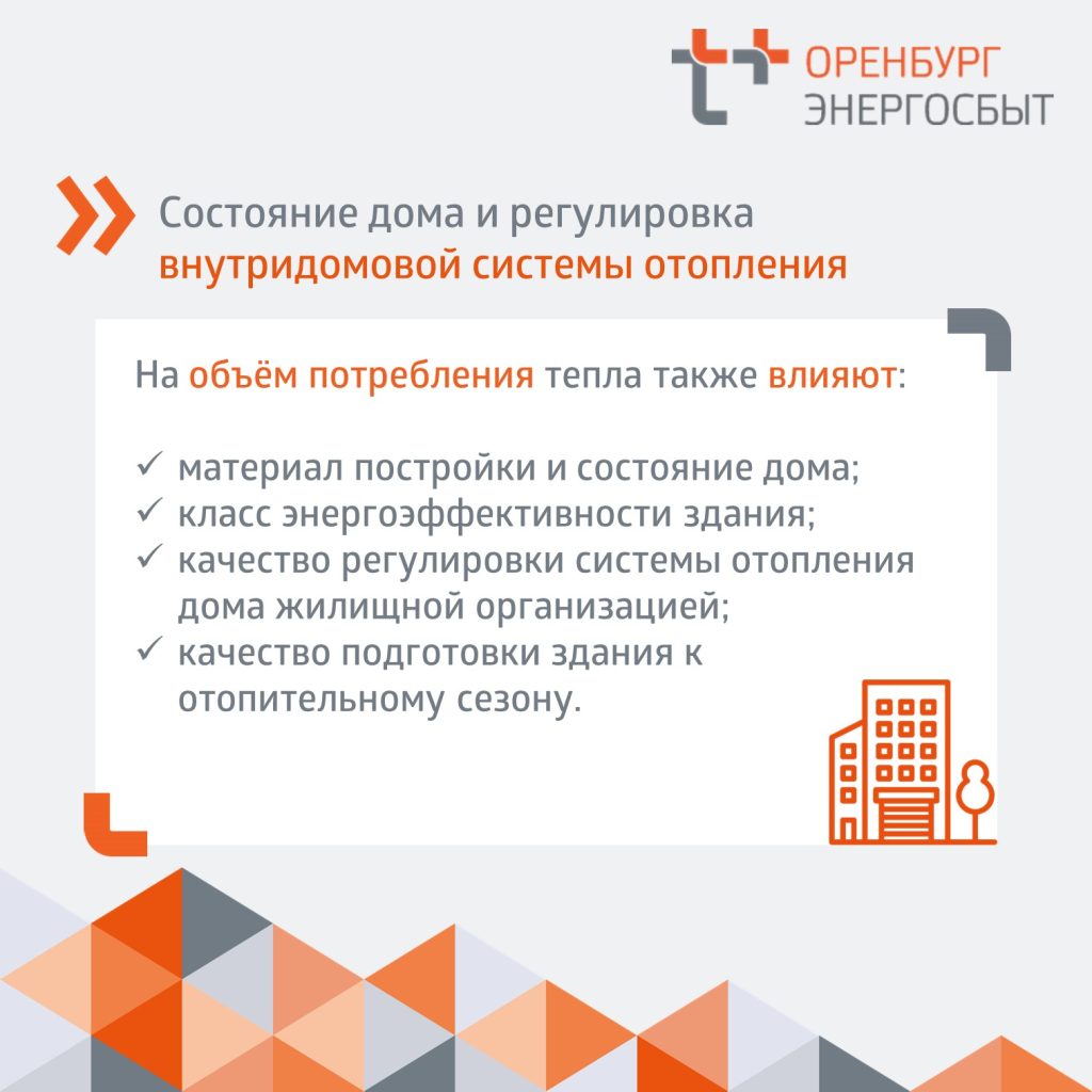 Кроме погоды на объём потребления тепла влияют материалы, из которых построен дом и его состояние, класс энергоэффективности здания, качество подготовки к отопительному сезону и регулировка системы отопления со стороны управляющих организаций.
