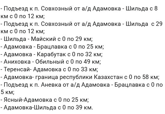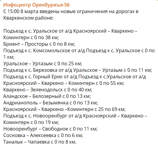 19.30 Движение перекрыто для всех типов т/с на а/д общего пользования Орск-Домбаровский-Светлый км 132+500 (примыкание к а/д подъезд к г.Ясный) — км 208+435 (Светлый), Светлый-Гостеприимный км 0+000 — км 26+460. Указанные дороги расположены в Домбаровском районе, Ясненском МО и Светлинском районе;
