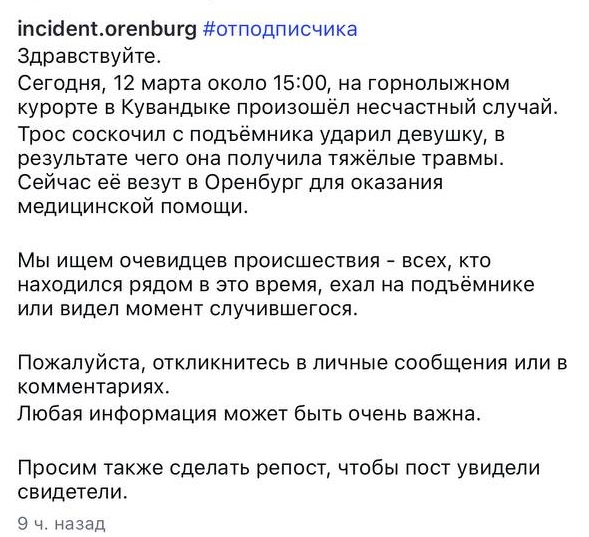 В социальных сетях ищут очевидцев происшествия на горнолыжном курорте в Оренбургской области.