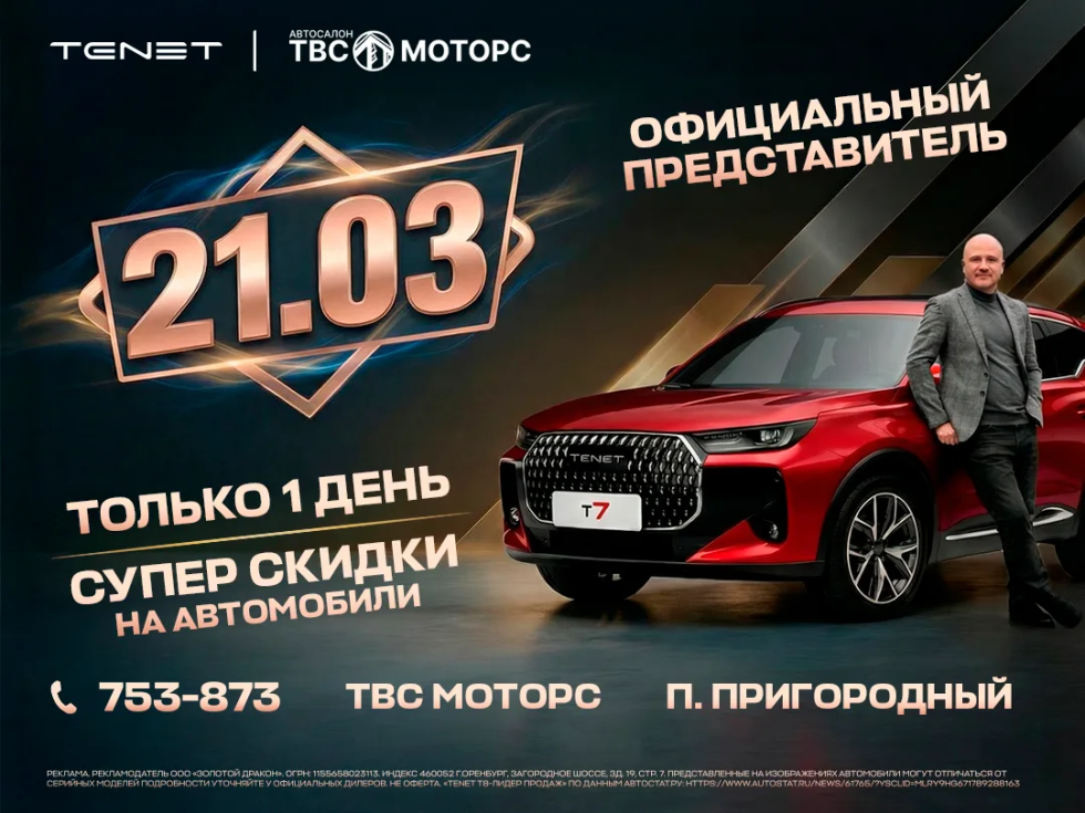 21 марта — знаменательный день. В гости к оренбуржцам приезжает Дмитрий Константинов, официальный представитель бренда TENET в России. Предложение доступно только в этот день и только на — 30 автомобилей.