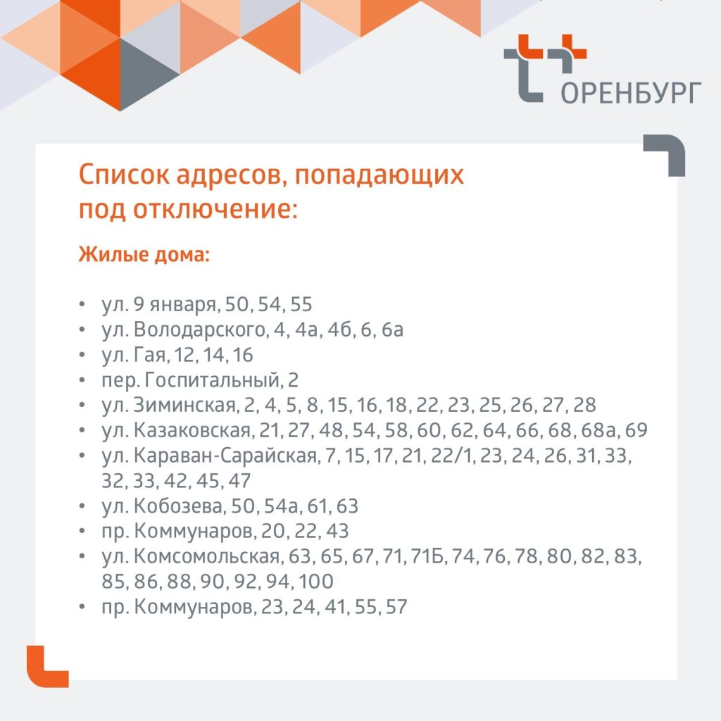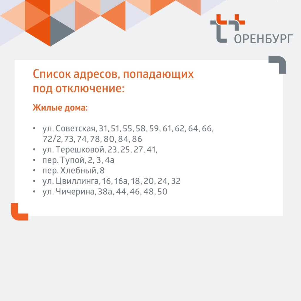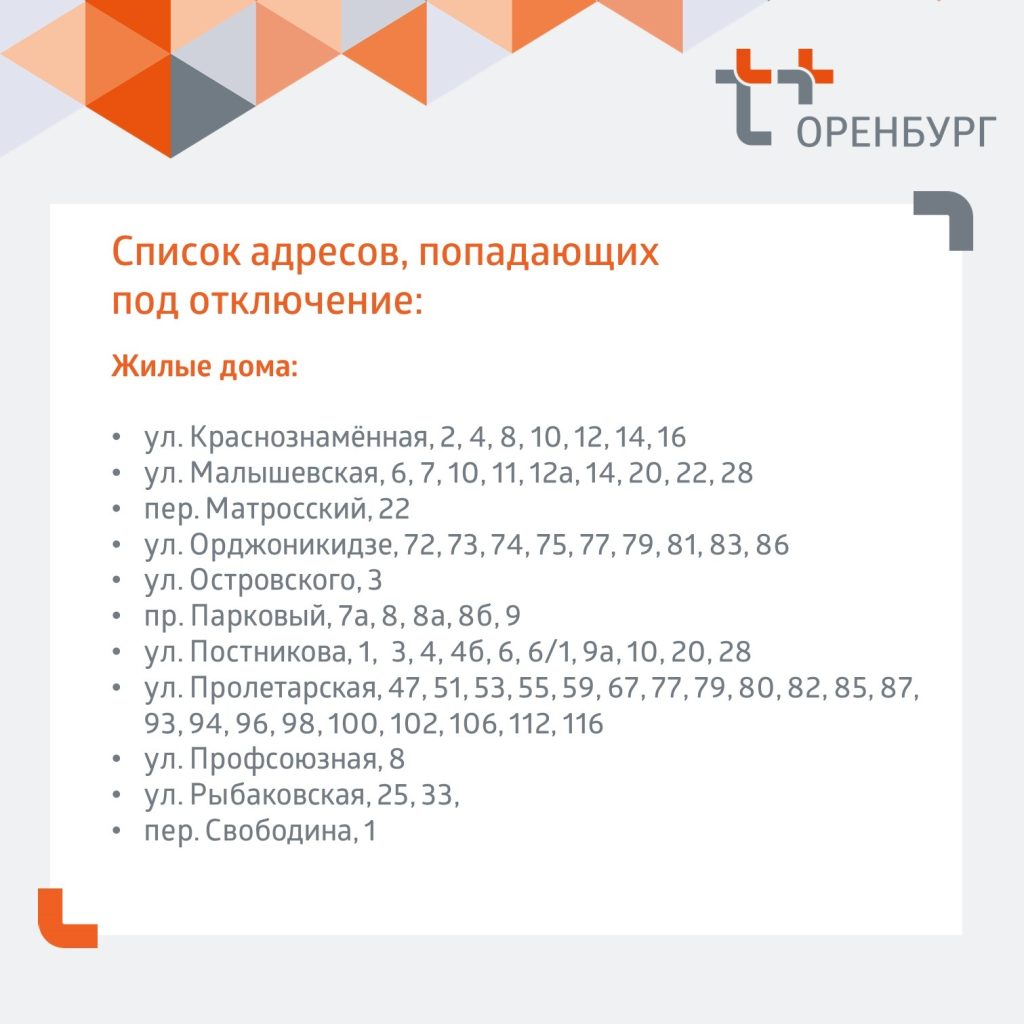 Нам предстоит заменить ненадёжный участок сети. На время ремонта будет отсутствовать отопление и горячая дома в домах по адресам, указанным на карточках, — сообщает официальный канал «Т Плюс» в Оренбургской области.