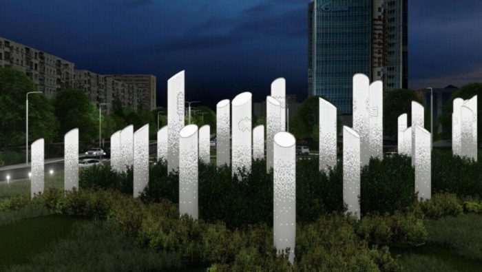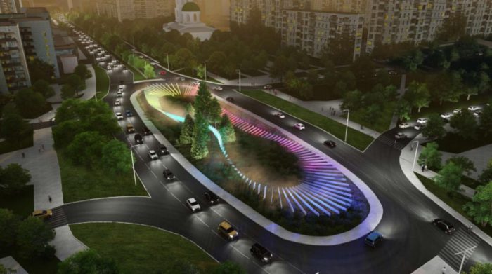 Третий вариант — овальные развязки, оформленные в виде символического шелкового пути. По периметру расположены прожекторы для варианта праздничного освещения, а внутри композиции паровые генераторы для создания микроклимата и придания выразительности подсветки.