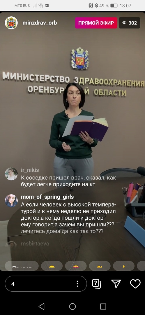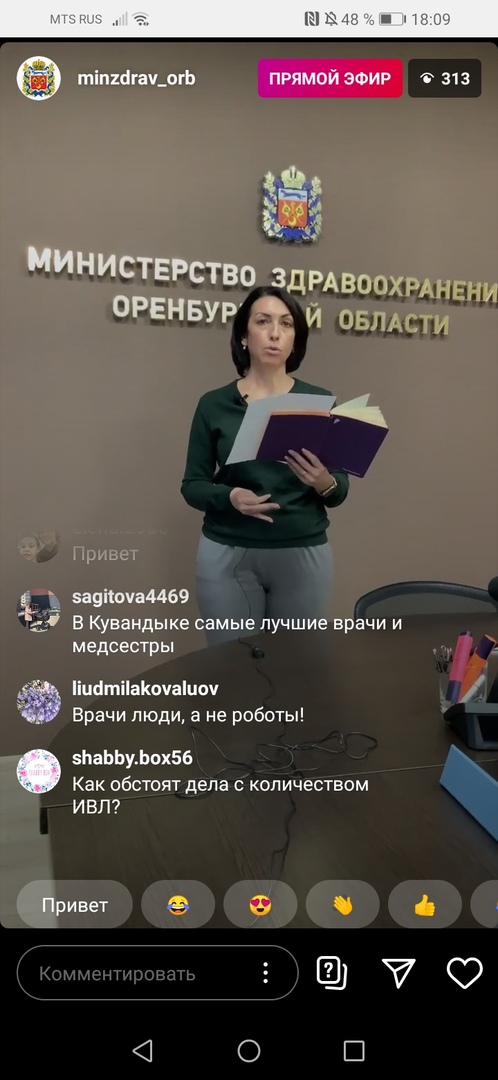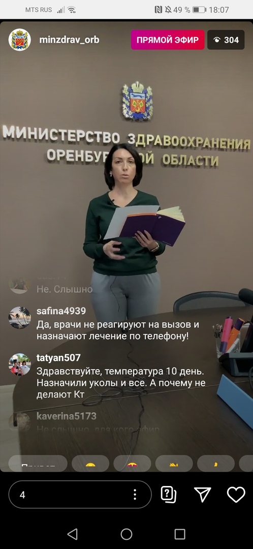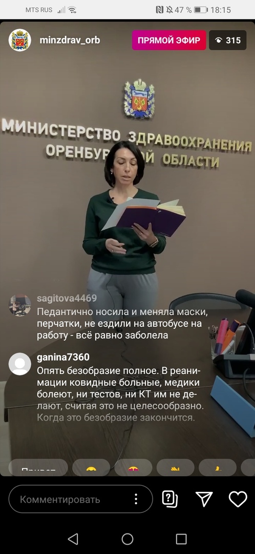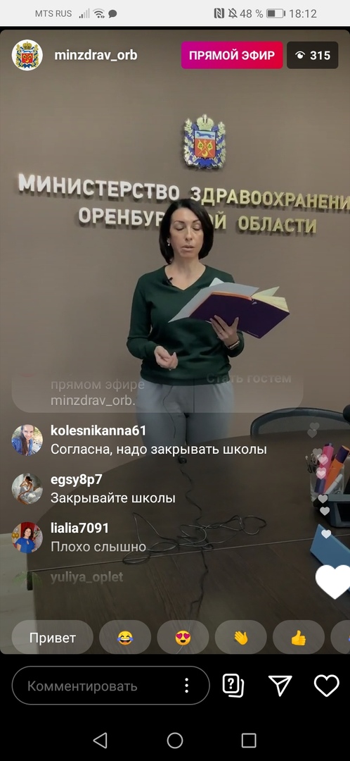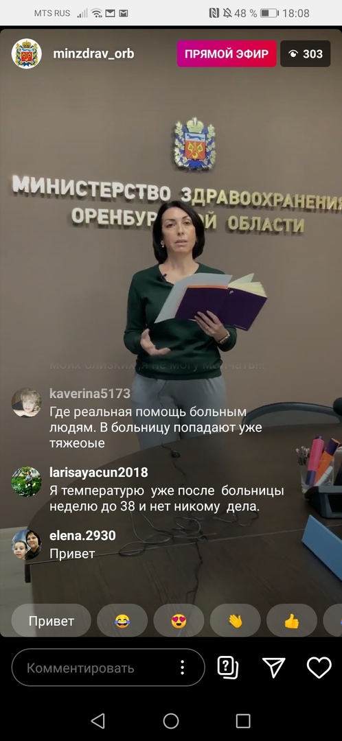 Министр здравоохранения Оренбургской области Татьяна Савинова провела очередной прямой эфир, в ходе которого доложила обстановку с заболеваемостью коронавирусом в регионе. Аудитория Instagram активно подключилась, заполнив эфир комментариями. В них были жалобы, слова благодарности медикам и просьбы закрыть школы.