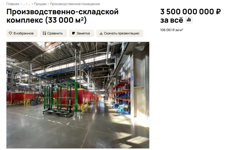 Речь идёт о предприятии общей площадью 33 тысячи квадратных метров, расположенном на земельном участке почти 12 гектаров. Комплекс включает производственные и складские помещения, административные здания и инфраструктуру для персонала. Территория полностью огорожена, к объекту подведены асфальтированные подъездные пути.