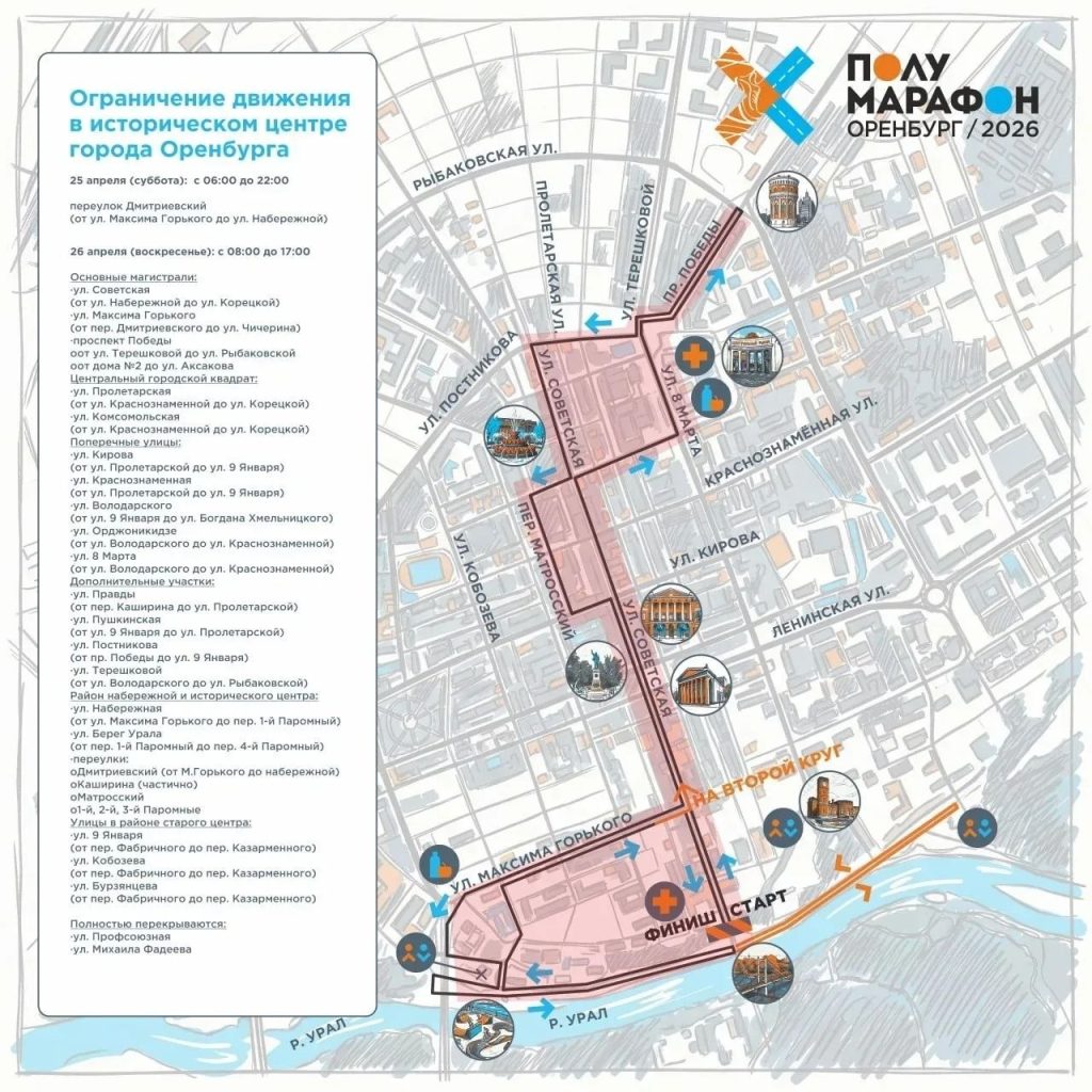 В центре Оренбурга на время проведения Полумарафона 26 апреля перекроют дороги и изменят автобусные маршруты.