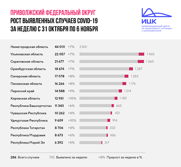 Лидером по темпам роста в Приволжском федеральном округе стали в Удмуртия и Кировская область – 10 %. На втором месте с приростом в 9% Пермский край. В Самарской и Пензенской областях количество случаев коронавируса выросло на 8%.