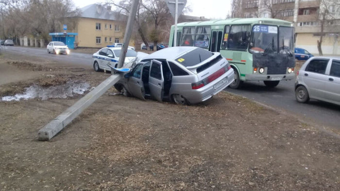 В Оренбурге на улице Ногина произошло серьезное ДТП. ВАЗ десятой модели врезался в опору линии электропередач.