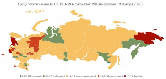Отметим, свои прогнозы ученый строит исходя из данных карты субъектов РФ по распространенности COVID-19, созданной на основе официальной статистики. Регионы поделены на пять групп в зависимости от динамики распространения: «зеленые», где показатель распространения меньше 0.9 (позитивный), «светло-желтые» — 0,9-1,0 (стабильный), “оранжевые” — 1,0-1,1 (удовлетворительный), «светло-красные» — 1,1-1,2 (отрицательный — неудовлетворительный); «темно-красные» — больше 1,2 (тяжелый). Распространение коронавируса показывает индекс Если он меньше единицы, то распространение замедляется, если больше — ускоряется.