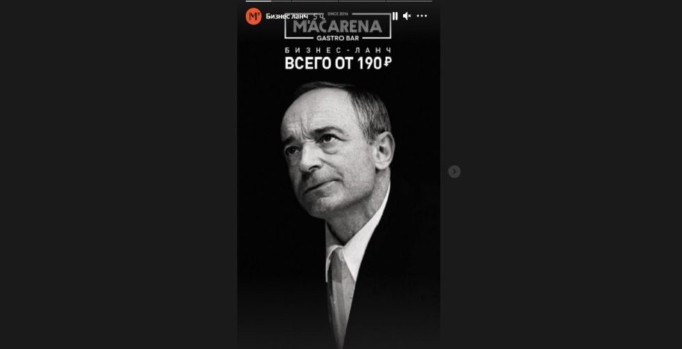 И если на неделе мир или Россия теряет великого человека — мы тоже об этом пишем. На наших обложках были Кобе Брайант, Шон Коннери, Диего Марадона. На этой неделе мы опубликовали Валентина Гафта. На обратной стороне меню можно прочитать о нем. «Макарена» вместе со всей Россией соболезнует этой огромной потере. Тут нет никакого умысла, никакой попытки кого-то задеть.
