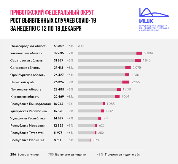 Аналогичная скорость распространения коронавирусной инфекции фиксируется в республиках Марий Эл и Мордовии. Отмечается, что данный показатель самый низкий в Приволжском федеральном округе.