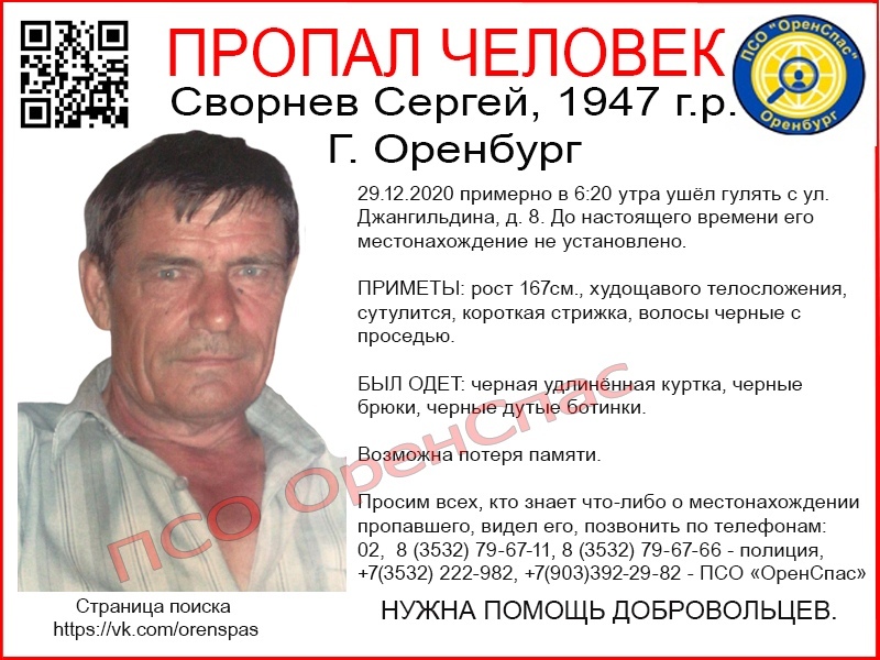 Всех, кто что-либо знает о местонахождении пропавшего или видел его, просят позвонить по телефонам: 02, 8 (3532) 79-67-11, 8 (3532) 79-67-66 — полиция, +7(3532) 222-982, +7(903)392-29-82 — ПСО «ОренСпас».