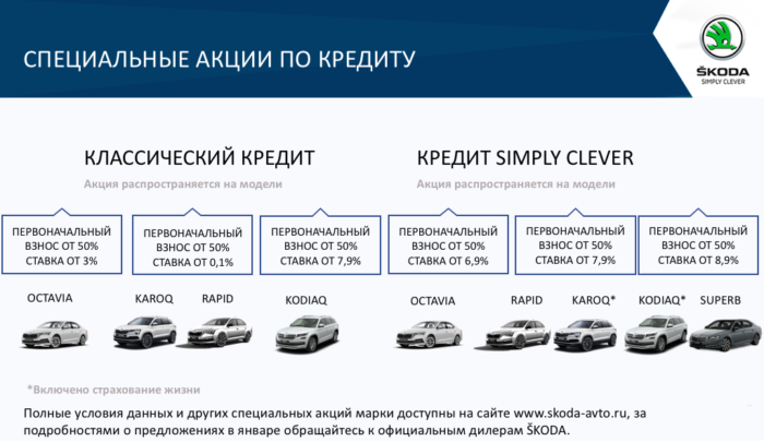В январе по-прежнему актуальны привлекательные условия при оформлении классического кредита и кредита SIMPLY CLEVER. Ставка на 12 месяцев по классическому кредиту при выборе моделей RAPID и KAROQ составит от 0,1% годовых, а для OCTAVIA – от 3% с первоначальным взносом от 50%. По кредиту SIMPLY CLEVER процентная ставка составит от 6,9% до 8,9%. Для новых владельцев KAROQ и KODIAQ также доступна специальная акция с тарифом по страхованию КАСКО 3%.