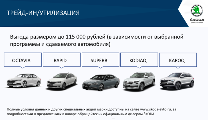 *Выгода достигается при покупке модели SUPERB, при условии сдачи своего автомобиля по системе трейд-ин (приобретение автомобиля с принятием в зачет стоимости прежнего автомобиля). Срок предложения с 1 по 31 января 2021 года. Количество автомобилей ограничено.