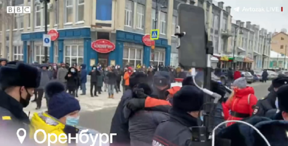 Кадры, на которых сотрудники ОМОНа задерживают участников акции протеста в Оренбурге 23 января показали в новостях BBC.