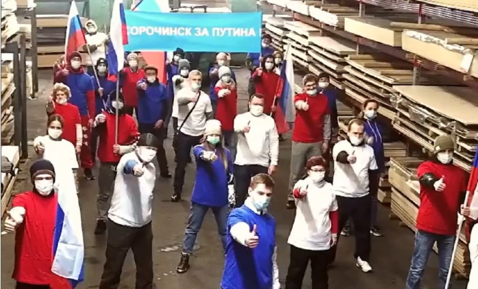 В Сорочинске несколько десятков активистов провели акцию в поддержку Президента. Они записали на видео в помещении склада танец с российскими треколорами и проскандировали несколько речевок в поддержку Путина. Участники акции были в масках.