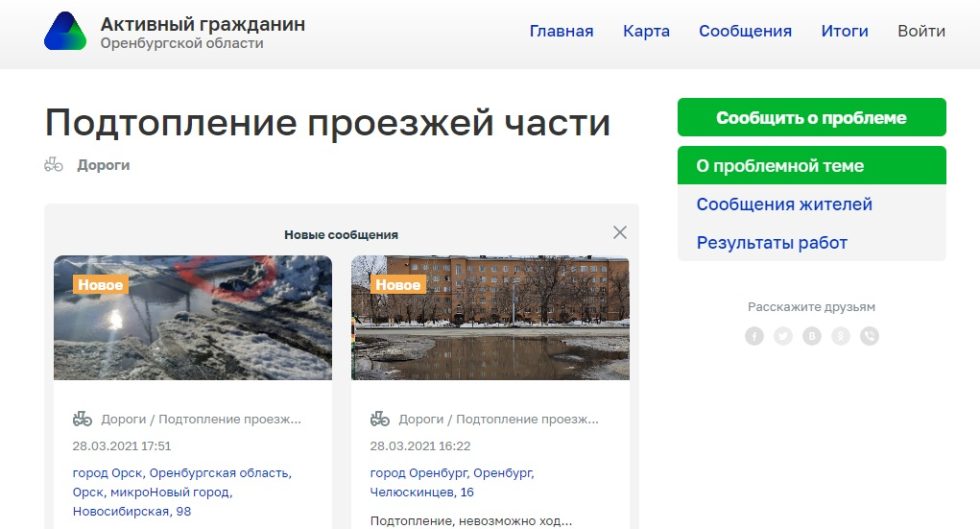 На сайте «Активный гражданин» жители Оренбургской области теперь могут пожаловаться на затопленные дороги.