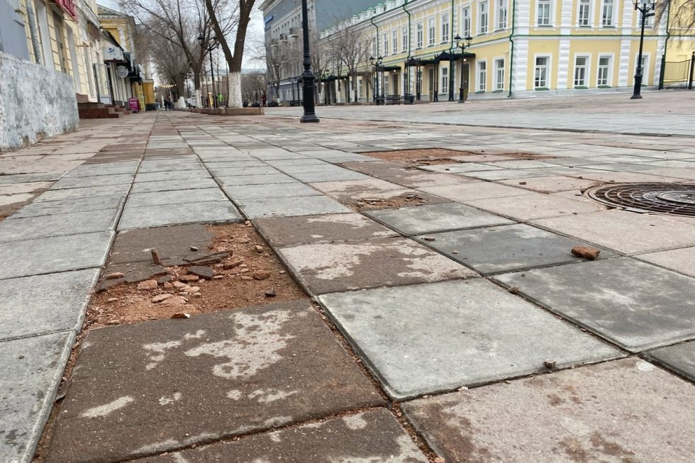 В Оренбурге гуляющие по улице Советской снова спотыкаются. На пешеходной зоне после зимы выжила не вся тротуарная плитка.