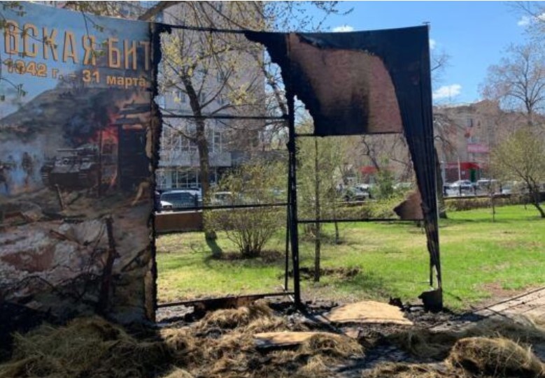 На записи видно, как пожарные тушат инсталляцию «Ржевская битва». Плакат сгорел полностью. Он украшал собой ансамбль инсталляций, оформлявших центр Оренбурга к 9 мая.