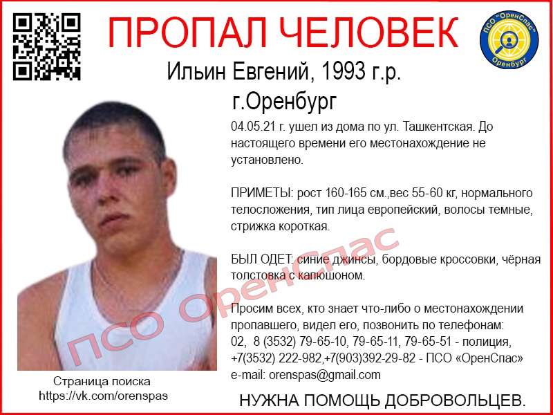 Всех, кому что-либо известно о местонахождении Евгения Ильина, просят позвонить по телефонам: 02, 8 (3532) 79-65-10, 79-65-11, 79-65-51 — полиция, +7(3532) 222-982,+7(903)392-29-82 — ПСО «ОренСпас».