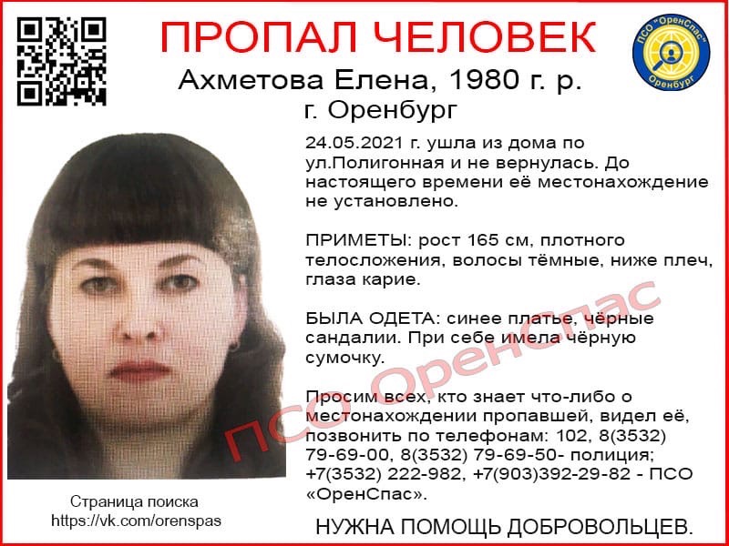 Всех, кто что-либо знает о местонахождении пропавшей или видел её, просят позвонить по телефонам: 102, 8(3532) 79-69-00, 8(3532) 79-69-50- полиция; +7(3532) 222-982, +7(903)392-29-82 — ПСО «ОренСпас».