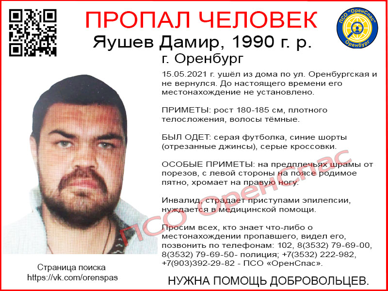 Всех, кто что-либо знает о местонахождении пропавшего или видел его, просят позвонить по телефонам: 102, 8(3532) 79-69-00, 8(3532) 79-69-50- полиция; +7(3532) 222-982, +7(903)392-29-82 — ПСО «ОренСпас».