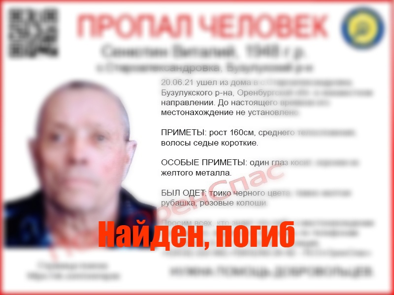 Как писал «Оренбург Медиа», житель Бузулукского района 1948 года рождения пропал 20 июня 2021 года. Он ушёл из дома в селе Староалександровка в неизвестном направлении и не вернулся домой. Поисками пенсионера занимались сотрудники полиции и поисковики «ОренСпаса».