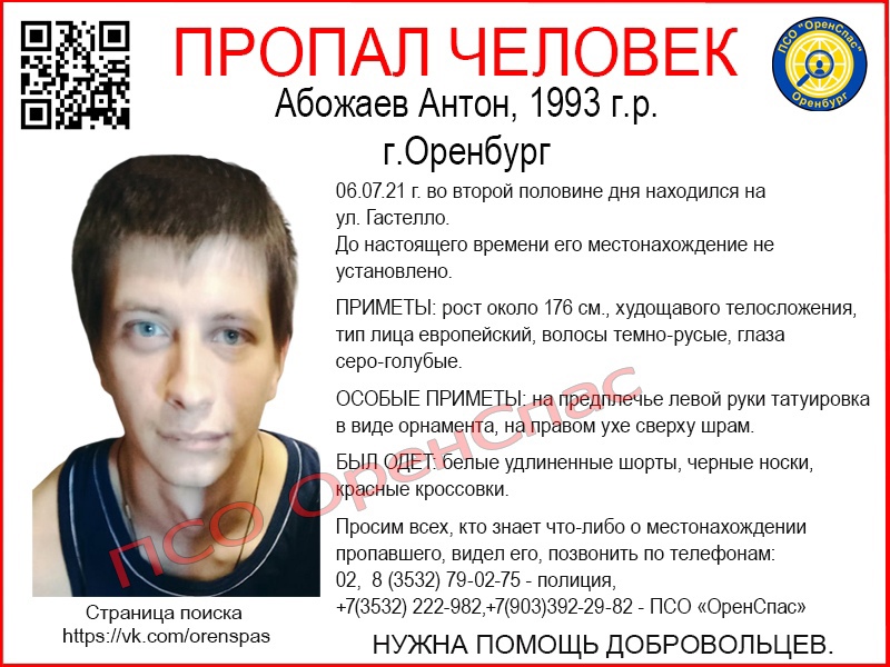 Всех, кто что-либо знает о местонахождении Антона Абожаева, просят сообщить по телефонам: 02, 8 (3532) 79-02-75 — полиция, +7(3532) 222-982,+7(903)392-29-82 — ПСО «ОренСпас».