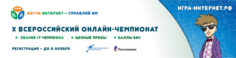 17 августа начнется регистрация участников на X Всероссийский онлайн-чемпионат «Изучи интернет — управляй им!». Соревнования для школьников и студентов до 18 лет проводят «Ростелеком» и Координационный центр национального домена сети интернет при поддержке Министерства цифрового развития, связи и массовых коммуникаций РФ и Роскомнадзора. Онлайн-чемпионат пройдет 9–25 ноября 2021 года на официальном сайте проекта игра-интернет.рф.