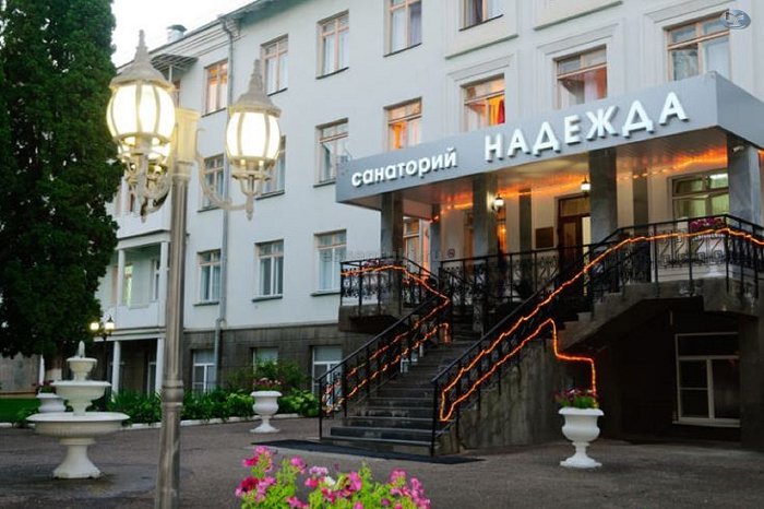 Комплекс из 3 зданий, соединённых крытыми переходами, компактно расположился в зелени деревьев, недалёко от входа в Лечебный парк. Санаторий «Надежда» выгодно отличается от других здравниц курорта своей камерной атмосферой. Учреждение рассчитано всего на 116 гостей. А это значит, что тишина, покой и индивидуальный подход гарантированы каждому, даже в самый разгар летнего сезона.