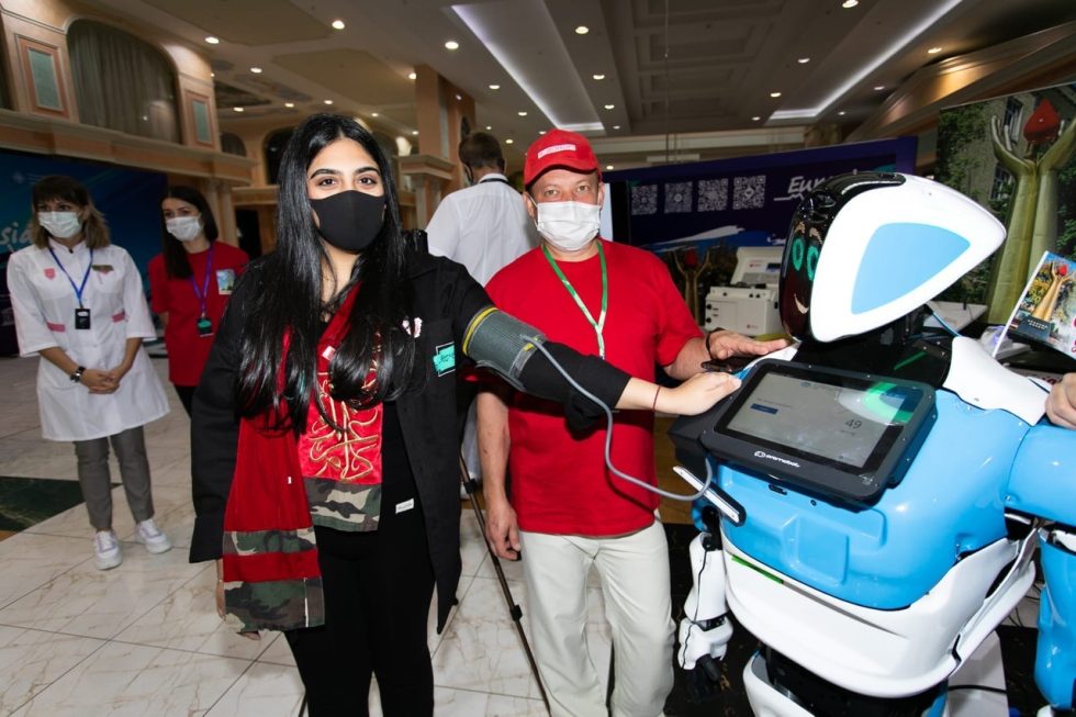 Участников форума на площадке Станции переливания крови встречает робот Майбот. Это уникальный робот — консультант, который в режиме реального времени определяет рост и вес, может измерить температуру и давление, консультирует по донорству крови и даёт советы по качественному здоровому долголетию.Майбот также танцует и поет. Он за считаные минуты стал «звездой» форума. Сотни фотокадров с роботом из Оренбурга разлетелись по всему миру.