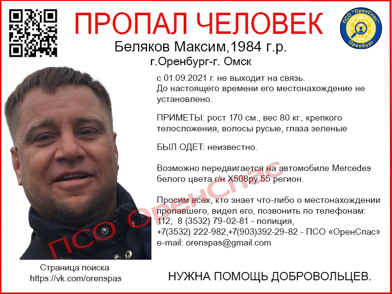 Всех, кто что-либо знает о местонахождении Максима белякова или видел его, просят позвонить по телефонам: 112, 8 (3532) 79-02-81 — полиция, +7(3532) 222-982,+7(903)392-29-82 — ПСО «ОренСпас».