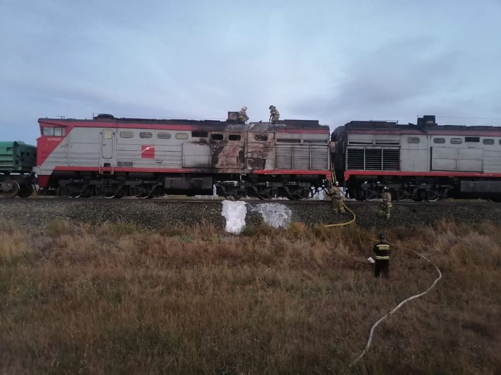 Сообщение о возгорании поезда с вагонами с рудой поступило в дежурную часть в 05.26. Прибыв по вызову, сотрудники МЧС выяснили, что горит моторный отсек локомотива.